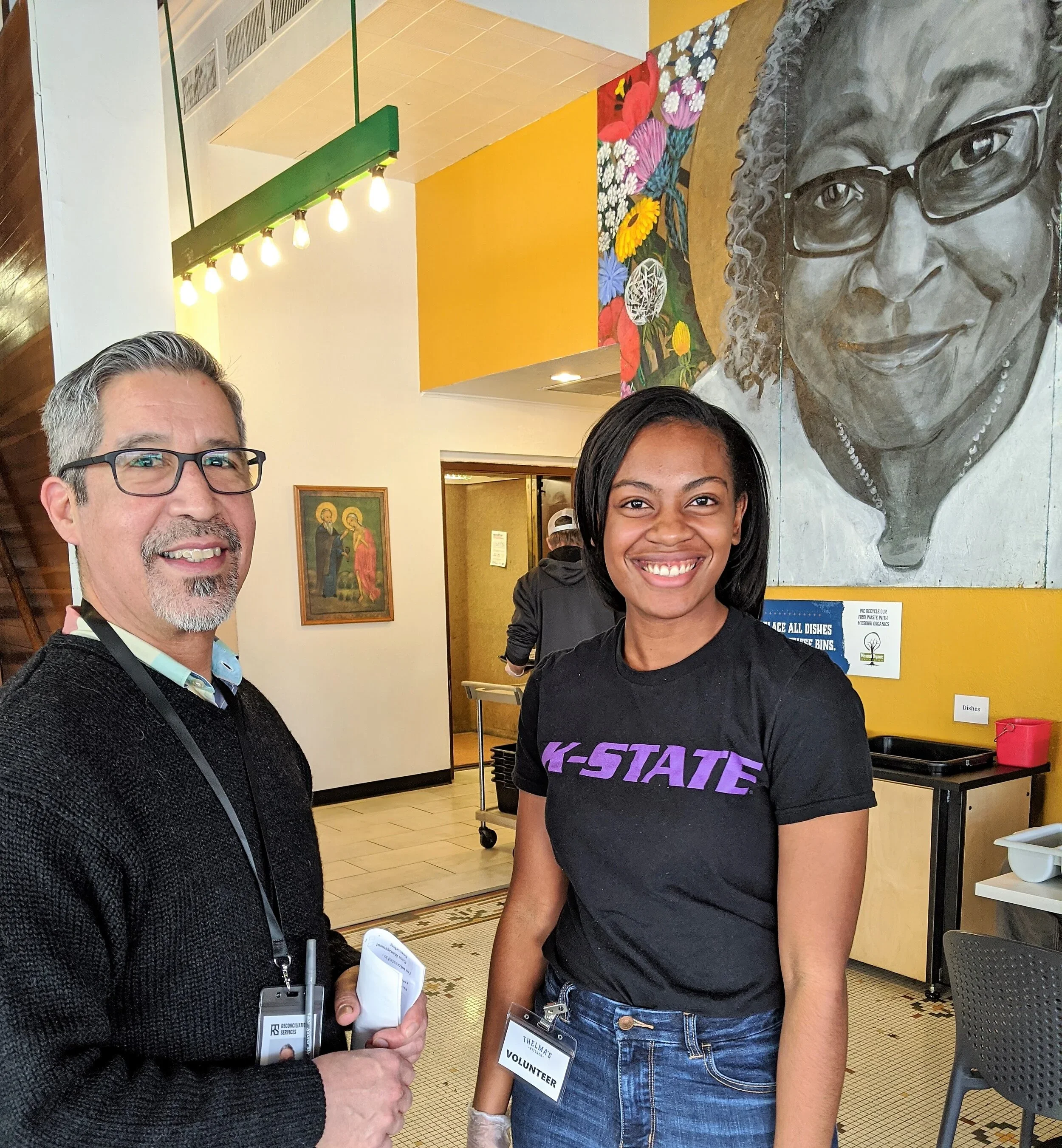 Frank Zwirlein, MSW, Urgent Care Advocate with a volunteer in Thelma’s Kitchen (pre-COVID 19)